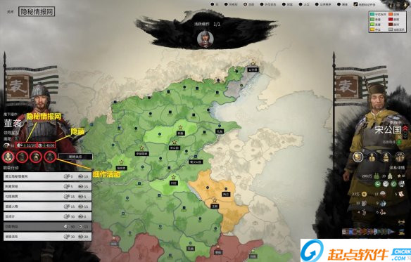 细作活动:显示细作可进行的各项行动,需要花费情报网和隐蔽值,也取决于细作的角色与职位。