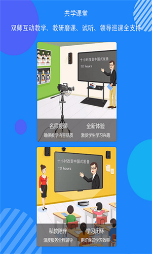 共学课堂app是在线互动教学工具,以多人真人互动视频教学、直播教学、课件录播和点播、互动板书、图文答疑等为主要教学方式,实现优质教育资源共享,助力学校和机构低成本快速扩展。适用于有分校的中大型学校和机构、中小型学校和机构、中小型在线教育网站、内容生产者、工作室等客户;适用于素质教育课程,如音乐、美术、舞蹈等的双师教学、在线辅导、在线陪伴等。