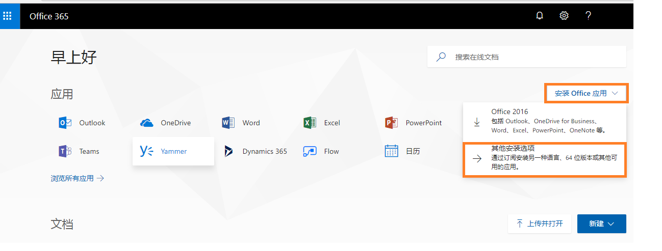 1.点击右上角安装office应用,选择第二项其他安装选项