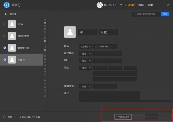 2、扫描结束后,选择需要备份的联系人名单,选择需要导出的文件格式。