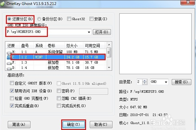 如果过了一段时间之后,系统运行比较慢, 您需要做的操作是还原C盘。这个时候,您需要选中”还原分区“, 编辑”GHO WIM ISO映像路径",选中当初备份的镜像文件,选中C盘, 点击“确定”, 如下图所示: