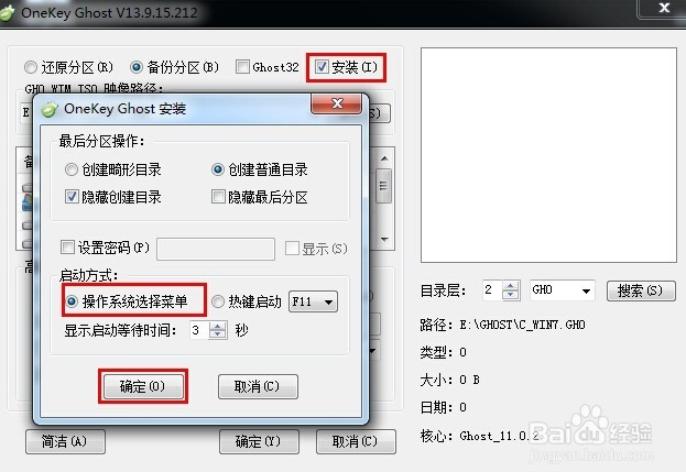 如果您需要安装onekey Ghost ,您可以选中“安装”选项,便可以设置在开机启动时显示onekey Ghost.