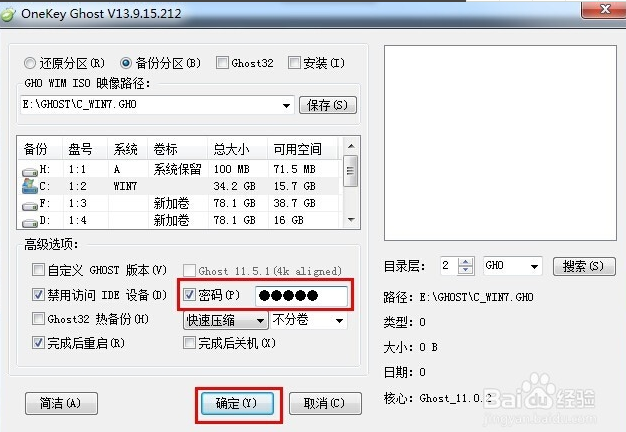 为了保证自己备份后的文件的安全性,可以选中“密码”选项,便可以设置密码,保证系统或者分区文件的安全性。