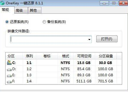 2、程序默认对当前系统所在分区进行备份、还原操作,可选择其他分区