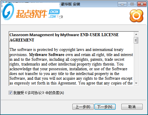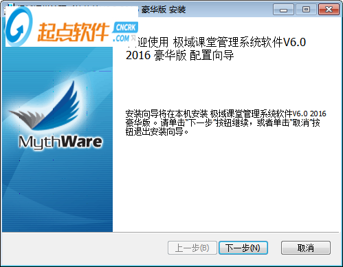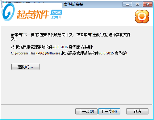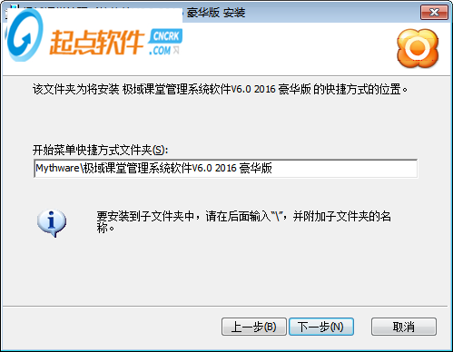 6、选择软件开始菜单文件夹,默认的文件夹“Mythware\极域课堂管理系统软件V6.0 2016 豪华版”,点击下一步;