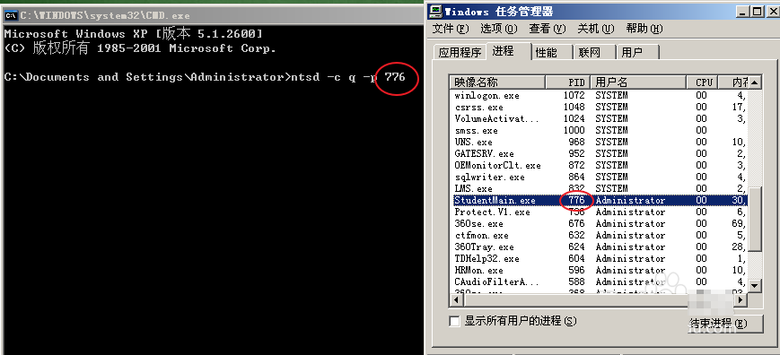 7、在控制台里输入ntsd -c q -p "PID" PID就是StudentMain.exe的标识号。点击回车之后就能顺利退出了。