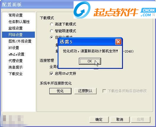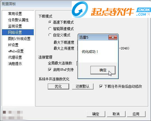 我们要做的是选择“工具”→“配置”命令,再单击左侧的“网络设置”,然后单击“系统半开连接数优化”下的“优化”按钮,再顺着向导操作即可。如果在Windows XP下则需要重新启动电脑以生效,如果在Windows Vista下还可以选中“下载任务开始后自动修改”复选框,让其自动优化。