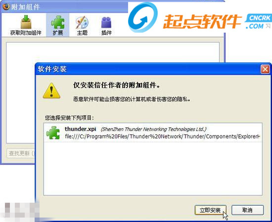 在另外一电脑上安装迅雷5.8.14.706版(下载地址:Thunder5.8.14.706.exe">http://down.sandai.net/Thunder5.8.14.706.exe),然后把C:Program FilesThunder NetworkThunderComponentsExplorerHelper文件夹复制到安装有迅雷5.9的安装文件夹下,如C:Program FilesThunder NetworkThunderComponents下(原来并没有ExplorerHelper文件夹)。之后试着在Firefox中选择“工具”→“附加组件”命令,再单击“扩展”标签,然后将C:Program FilesThunder NetworkThunderComponentsExplorerHelper hunder.xpi拖放到“附加组件”的“扩展”窗口,之后像安装正常的扩展一样安装之,最后重新启动Firefox。