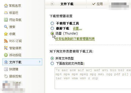 默认情况下,迅雷5.9也没有提供对Maxthon下载的支持(在相应窗口设置为灰色),但是经笔者试用,发现只要一个小的设置就可以解决问题:在Maxthon中选择“工具”→“傲游设置中心”,单击“文件下载”项,在“下载管理器设置”下可以选择“迅雷 (Thunder)”(如图9)。之后直接单击相应的下载链接,就可以看到迅雷5.9下载窗口。