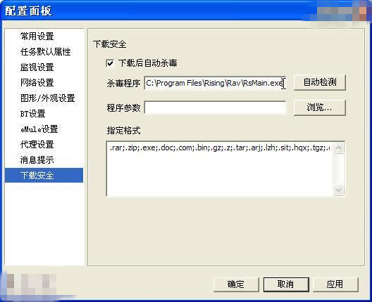 ★如果嫌迅雷对下载的每个文件都进行病毒扫描太占用时间,则可以通过定制让杀毒软件只对一些如“.exe”、“.com”和“.dll”等“高危文件”进行病毒扫描,定制方法非常简单。只要在“指定格式”处删除一些不需要的扩展名即可。