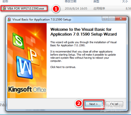 下载后VBA FOR WPS 7.0.1590.exe双击开始安装点击下一步继续。