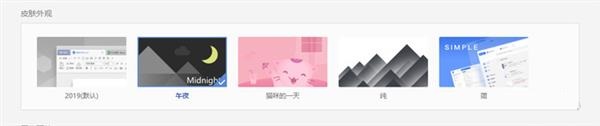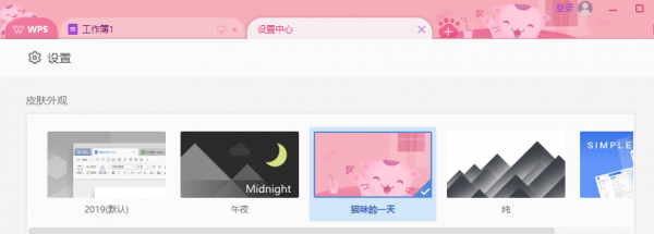 WPS Office 2019支持换肤功能,用户可以设置不同风格的皮肤外观,目前内置了五种不同风格的皮肤界面