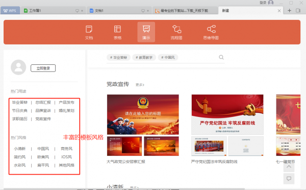 通过WPS Office 2019的新建按钮,我们可以像以前那样新建WPS文字、WPS表格、WPS演示文档以及流程图、思维导图以及秀堂,依然可以选择丰富的内置模板。