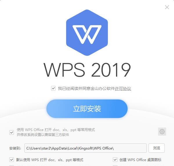 WPS Office 2019的安装依然采用一键安装模式,在安装选项中则多了一个“默认使用wps打开pdf文件的选项”,看来新版对PDF文档的支持应该有所增强。安装包大小为96.6 MB,依然小巧玲珑,依然对个人用户实施免费策略。