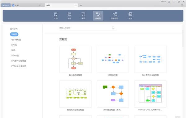除了WPS文字、WPS表格、WPS演示三大功能套件外,WPS Office 2019还支持了流程图(内置多种类型流程图及丰富模板)及思维导图(同样内置丰富模板)。这样一来,办公人员就不用另外安装其它软件来补充这两个较常用到的办公文档类型的制作了。