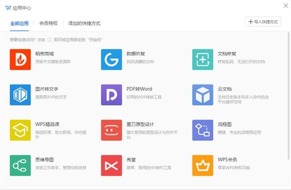 WPS Office 2019带有一个应用中心,用户可以用它来添加一些实用的小工具,如文档修复、PDF转Word、数据恢复等,不过部分工具需要会员才能使用。