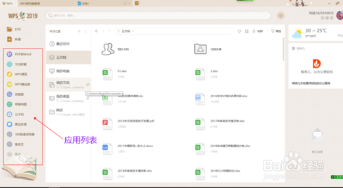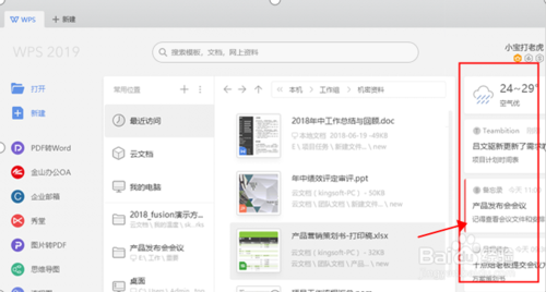 在WPS Office 2019主界面,左侧的上方为新建和打开这两个基础功能,下方是是功能选项栏和附加功能选项,在中间部分显示的是最近文件打开历史记录(可以同步显示多设备文档内容)。而在最右侧上方是天气预报中心,下方则有个消息中心,通知用户云文档更新情况、待办事宜、备注事项。