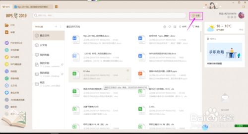 打开程序wps2019,进入wps首页界面,屏幕右上角,鼠标单击“设置”,如下图所示: