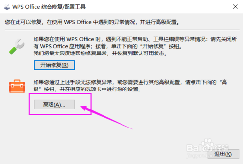 4、点击之后,将会弹出“WPS Office 综合修复/配置工具”窗口。在这个窗口中,点击“高级”。