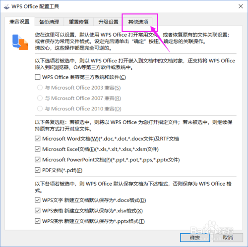 弹出[wps office配置工具]窗口中,单击标签“其他选项”,如下图所示: