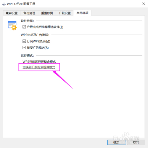在其他选项中的[运行模式]选项下,选择“切换到旧版的多组件模式”,单击[确定]按钮即可。如下图所示: