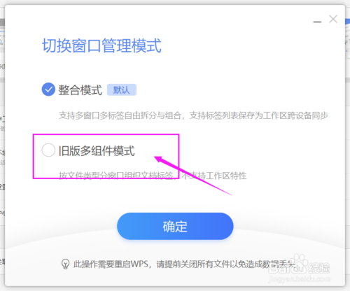 在[切换窗口管理模式]对话窗口,勾选“旧版多组件模式”,单击[确定]按钮即可。如下图所示: