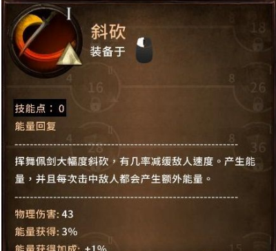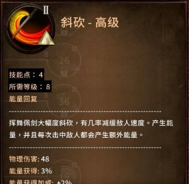 二级斜砍8级就可以解锁,作为能量产生技能拥有很不错的攻击范围和伤害。