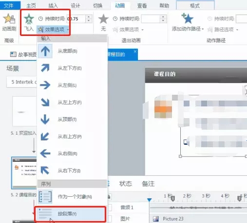 在“动画”菜单中选择动画方式,如下图所示“飞入”;