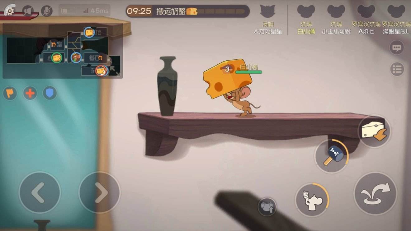 对战刚开始时,侦探杰瑞就能利用隐身技能四处打探情况,一方面寻找大奶酪和鼠洞,另一方面也监控猫咪的动态,通过语音向队友预警。