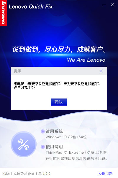 如果不是ThinkPad机型那么在使用工具时会弹出相应的提醒,点击“确认”即可退出工具。如图6所示: