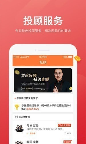 股掌柜严为民投顾团队领衔三大天王和上百位专业投顾汇聚股掌柜全天候为用户提供专业、全面、优质、准确的在线投顾服务;您只需要摇一摇即可唤起投顾助理,投顾助理提供专业的24小时在线咨询服务,让用户满意度;
