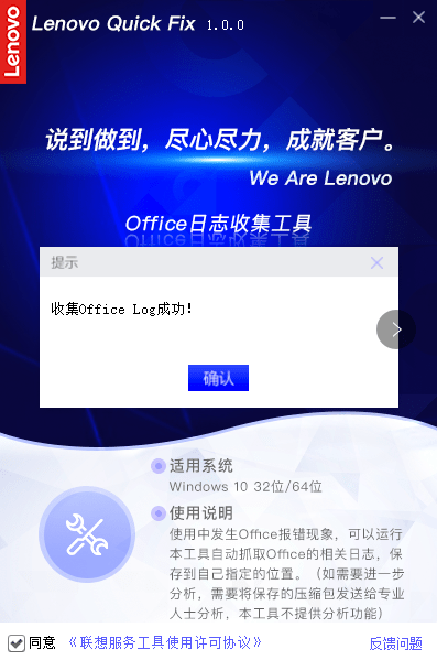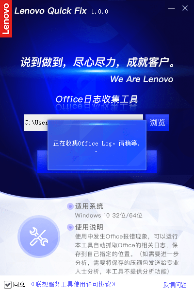 Office日志收集工具是联想Lenovo Quick Fix为方便用户收集Office的相关日志而研发的一个系统自动收集工具。在你使用Office的过程中发生了报错现象,它可以一键自动抓取相关日志并且保存到指定的位置。