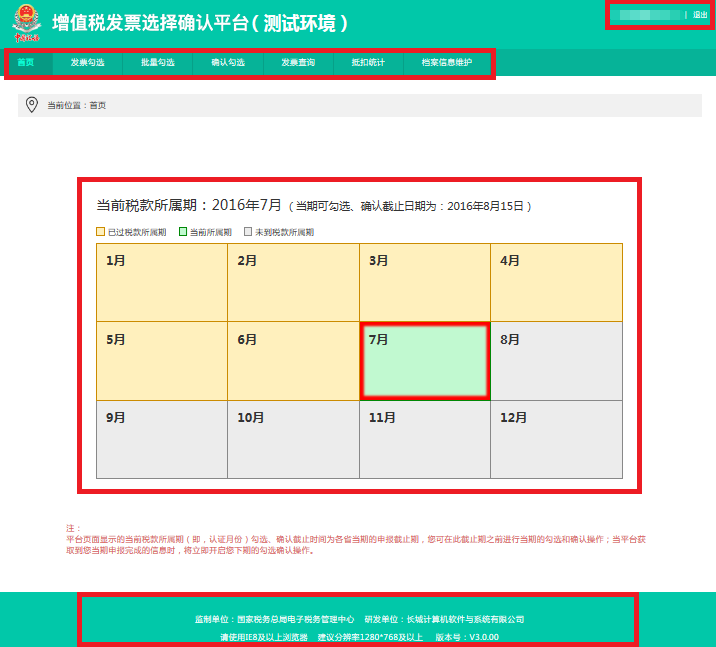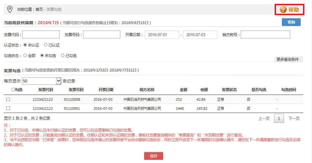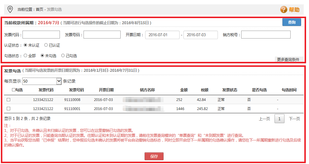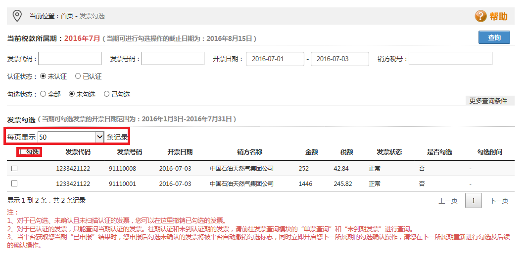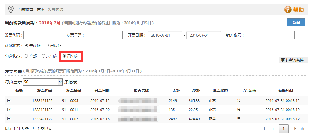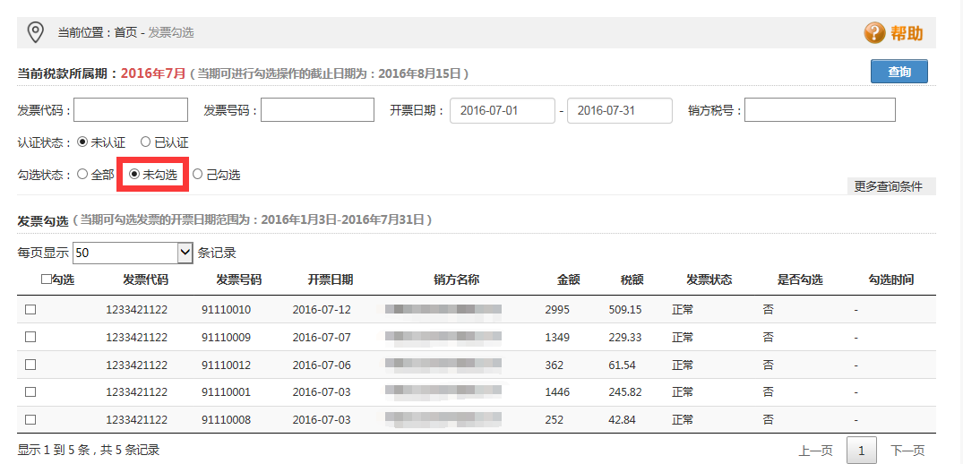 (2)下部为查询结果的勾选操作区域,本期可勾选发票的截止日期为2016年8月15日。