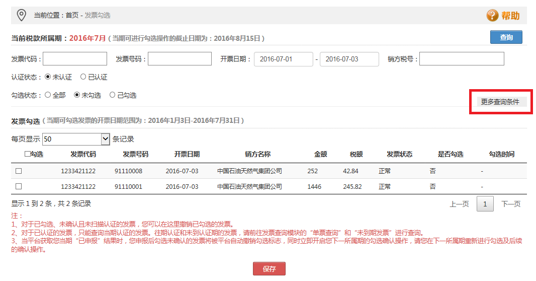 在此功能中分为上、下两个区域,即查询条件区域和发票查询结果勾选操作区域。