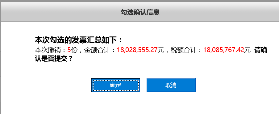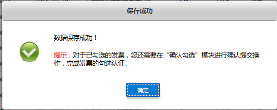 (4)完成本次所有发票的勾选或撤销操作后,点击“保存”按钮,系统会提示本次勾选或撤销勾选的发票汇总情况,点击“确定”按钮即可完成所有勾选发票的保存操作(所有发票全部勾选完成后保存一次即可,不需要在每一个查询结果分页中分别点击保存操作);