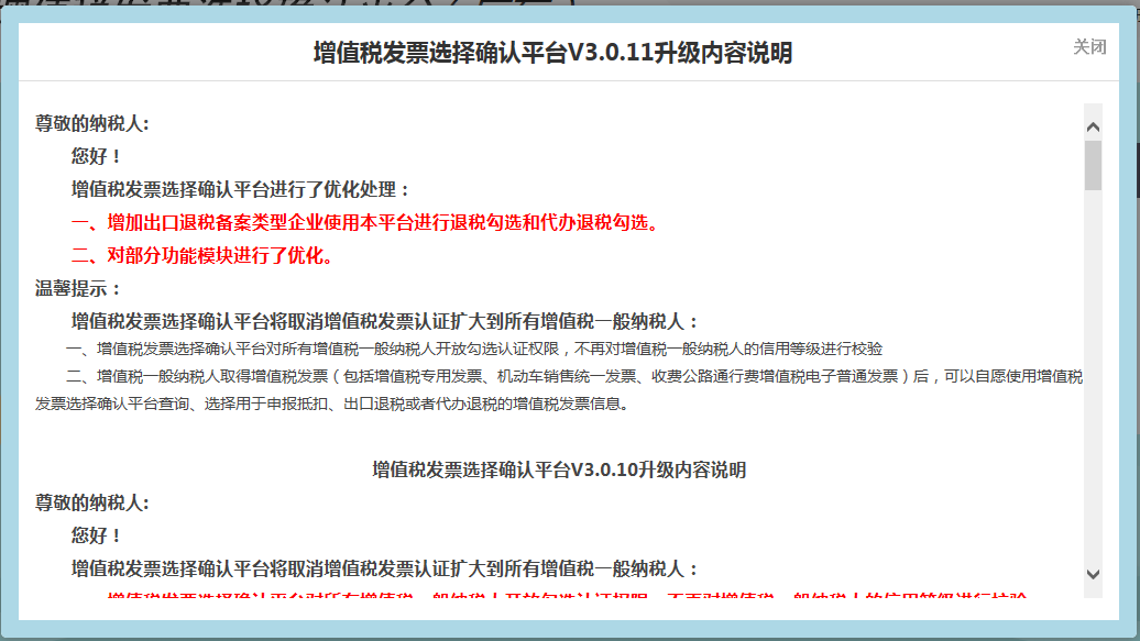 “增值税发票查询平台V3.0.11.升级内容说明”窗口。