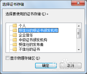 5、在“选择证书存储”对话框中选择“受信任的根证书颁发机构”,点击确定: