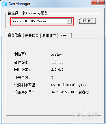 2、将金税盘连接到本地电脑的USB接口后(首次需要等待系统完成驱动的自动加载方可),点击“刷新”按钮,可以刷新到AisinoKey设备即表示驱动安装正常。