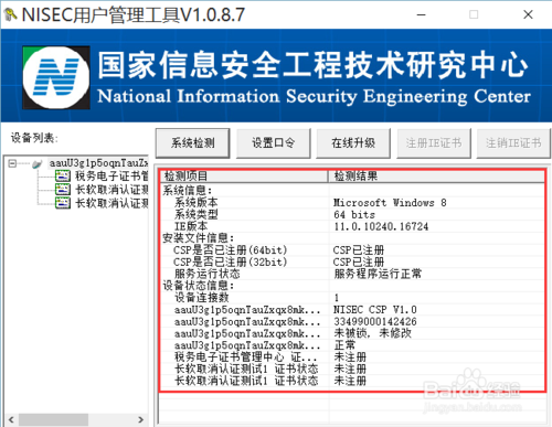 2、将税控盘连接到本地电脑的USB接口后(首次需要等待系统完成驱动的自动加载方可),点击“系统检测”按钮,可以显示如下信息即可:
