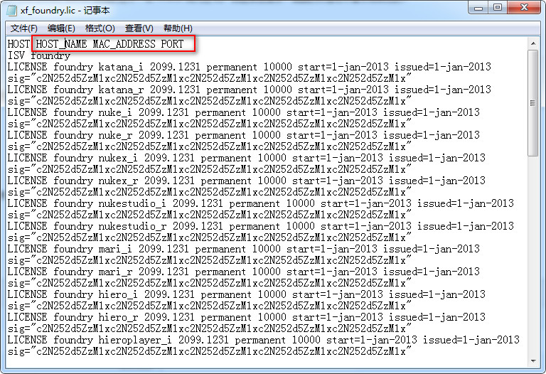 5、在crack中找到xf_foundry.lic,右键以记事本方式打开,如图所示,我们需要替换计算机名和物理地址