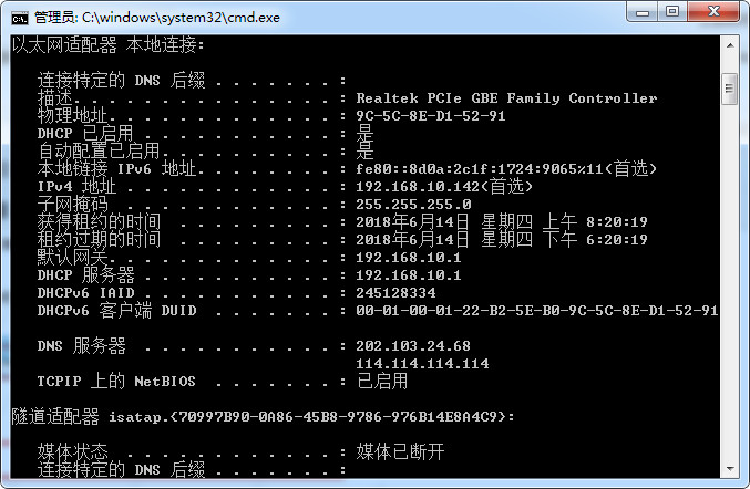 6、物理地址查看方法是在开始菜单里面点击“运行”输入“cmd”,然后在弹出窗口输入“ipconfig/all”点击回车就出来了