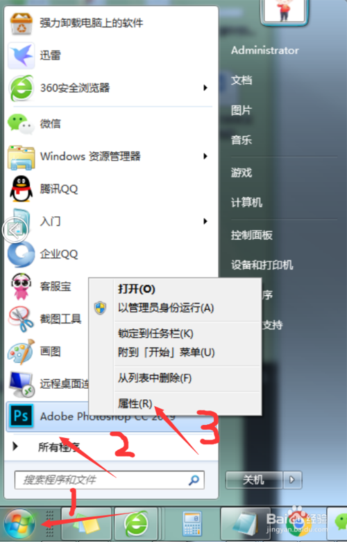 2、我们先把软件关闭后,在开始菜单找到安装的软件快捷键,再右键选择属性。
