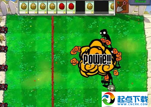 让僵尸先过来,上面的石头块攒满的时候,或者僵尸到红线跟前了,扔吧。红的不要乱扔,那可以炸一片。跟打保龄球似的...