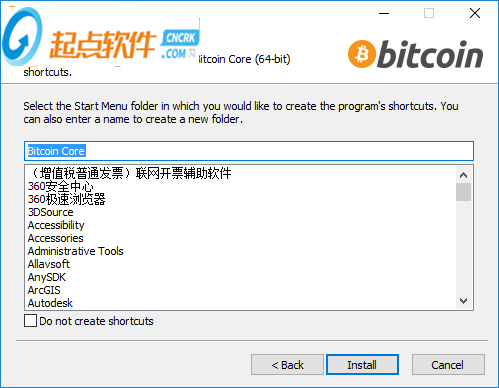3、确认安装将在开始菜单中创建名为"Bitcoin Core"的菜单项,本系统运行的快捷方式存储在该菜单中,选择好后点击『下一步』: