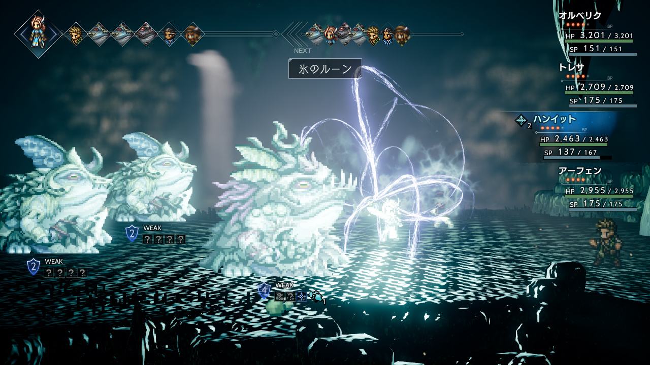 基础知识每回合,玩家和敌人的每名角色会进行一次攻击,攻击的先后顺序显示在屏幕左上角,在它的右边显示了下一回合的攻击顺序。 每位角色的伤害类型因其所携带的武器,使用的魔法不同而有所变化。此外游戏中每个敌人的血量的都是隐藏的,在它们的生命值降到0之后就会从战场上消失