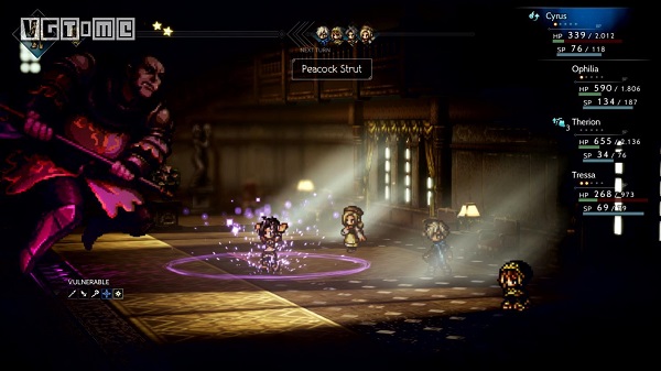 每回合,玩家和敌人的每名角色会进行一次攻击,攻击的先后顺序显示在屏幕左上角,在它的右边显示了下一回合的攻击顺序。 每位角色的伤害类型因其所携带的武器,使用的魔法不同而有所变化。此外游戏中每个敌人的血量的都是隐藏的,在它们的生命值降到0之后就会从战场上消失