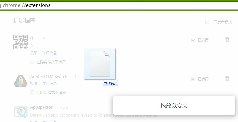 第四步,拖放刚刚的crx文件到界面里,松开鼠标,会弹出安装提示,点击确定安装就可以了