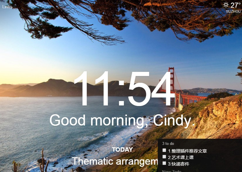 Chrome标签页美化插件是一款自动更换壁纸,自带时钟,任务日历和工作清单的chrome浏览器插件。官方的解释就是:替换你 Chrome 浏览器默认的“标签页”。里面的图片全部来自500PX里面的高清图,无广告,无弹窗,非常适合笔记本使用,让装逼再上新台阶。让我来感受下出自细节,触及心灵的美。我们知道Chrome 的新标签页默认会显示经常访问的网页,多数情况下会比导航网站靠谱,但是我们是不是会觉得新标签页由于多年没换过,偶尔换个新鲜养眼的也不错?Chrome标签页美化插件就是能帮助我们解决这个问题的,能给老掉牙的 Chrome 新标签页换个样式,首先添加一个漂亮的风景照,右上角显示当前城市天气,右下角可添加待办事项 Todo 列表,正中间显示系统时间以及今天的主要目标,想切换回原标签页,点击左上角 Apps 即可。