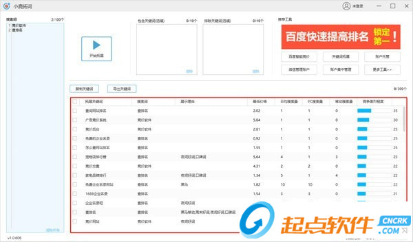 拓词成功:拓词结果直接展示在下方列表中,同时展示拓展关键词的展现理由、最低价格、日均搜索量、PC搜索量、移动搜索量、竞争激烈程度数据,支持排序筛选方便快速找到高质量的关键词。