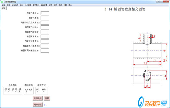 本类型为圆管(含椭圆管)类的连接管构件,包括各种圆管形等径弯头、三通、蛇行管构件,各种异径的三通连接管构件,还有椭圆管、圆管相交椭圆管,椭圆管相交圆管,椭圆管相交椭圆管构件等15种形式。构件品种齐全,各个构件内的各部尺寸、倾斜角度、偏心量可在一定范围内任意输入。